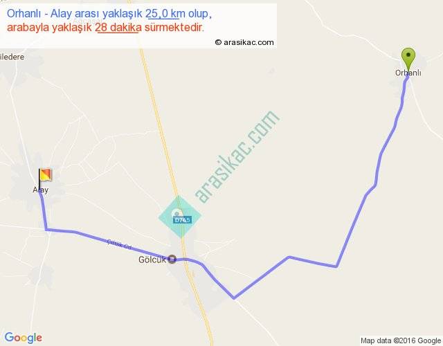 Orhanlı - Alay arası yaklaşık olarak 90 km/h ile yukarıda belirtilen sürede olup, iki yerin kuş uçuşu uzaklığı (mesafesi) 17'dir. Yolculuk otobüsle 36 dakika sürmektedir.