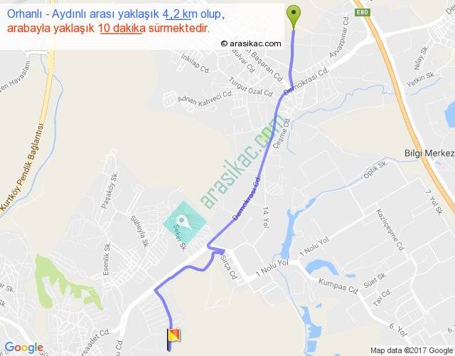 Orhanlı - Aydınlı arası yaklaşık olarak 90 km/h ile yukarıda belirtilen sürede olup, iki yerin kuş uçuşu uzaklığı (mesafesi) 3'dir. Yolculuk otobüsle 13 dakika sürmektedir.