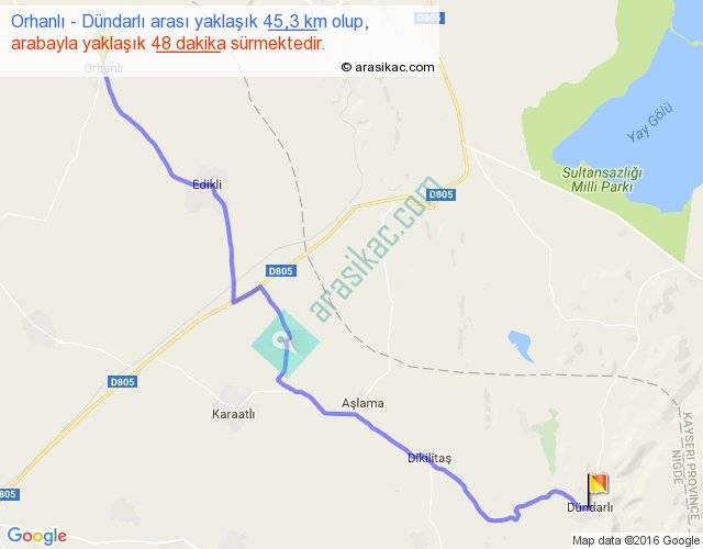 Orhanlı - Dündarlı arası yaklaşık olarak 90 km/h ile yukarıda belirtilen sürede olup, iki yerin kuş uçuşu uzaklığı (mesafesi) 36'dir. Yolculuk otobüsle 1 saat 2 dakika sürmektedir.