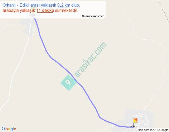 Orhanlı - Edikli arası yaklaşık olarak 90 km/h ile yukarıda belirtilen sürede olup, iki yerin kuş uçuşu uzaklığı (mesafesi) 8'dir. Yolculuk otobüsle 14 dakika sürmektedir.