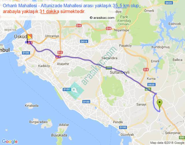 Orhanlı Mahallesi - Altunizade Mahallesi arası yaklaşık olarak 90 km/h ile yukarıda belirtilen sürede olup, iki yerin kuş uçuşu uzaklığı (mesafesi) 29'dir. Yolculuk otobüsle 40 dakika sürmektedir.