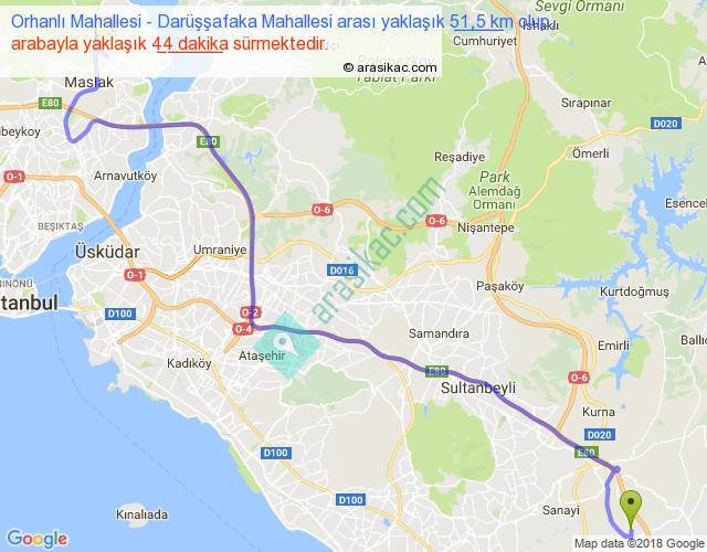 Orhanlı Mahallesi - Darüşşafaka Mahallesi arası yaklaşık olarak 90 km/h ile yukarıda belirtilen sürede olup, iki yerin kuş uçuşu uzaklığı (mesafesi) 37'dir. Yolculuk otobüsle 57 dakika sürmektedir.