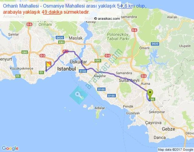 Orhanlı Mahallesi - Osmaniye Mahallesi arası yaklaşık olarak 90 km/h ile yukarıda belirtilen sürede olup, iki yerin kuş uçuşu uzaklığı (mesafesi) 41'dir. Yolculuk otobüsle 1 saat 3 dakika sürmektedir.