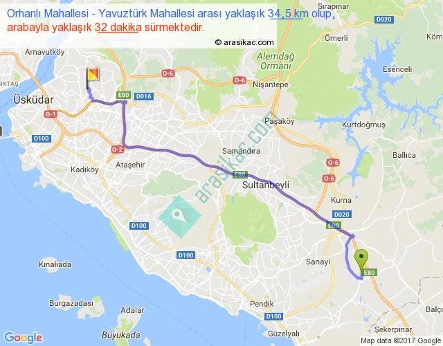 Orhanlı Mahallesi - Yavuztürk Mahallesi arası yaklaşık olarak 90 km/h ile yukarıda belirtilen sürede olup, iki yerin kuş uçuşu uzaklığı (mesafesi) 27'dir. Yolculuk otobüsle 41 dakika sürmektedir.