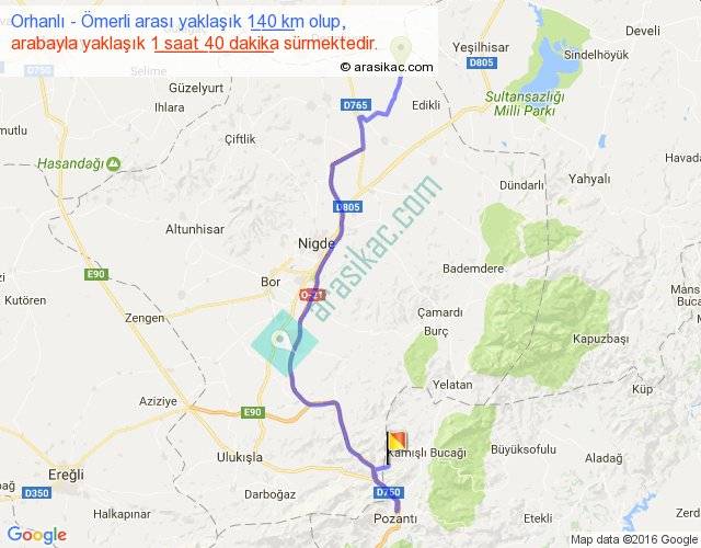 Orhanlı - Ömerli arası yaklaşık olarak 90 km/h ile yukarıda belirtilen sürede olup, iki yerin kuş uçuşu uzaklığı (mesafesi) 85'dir. Yolculuk otobüsle 2 saat 10 dakika sürmektedir.