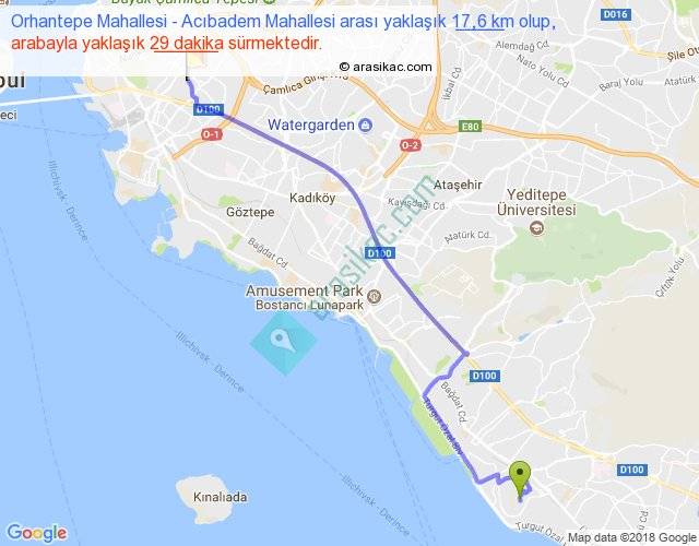 Orhantepe Mahallesi - Acıbadem Mahallesi arası yaklaşık olarak 90 km/h ile yukarıda belirtilen sürede olup, iki yerin kuş uçuşu uzaklığı (mesafesi) 14'dir. Yolculuk otobüsle 37 dakika sürmektedir.