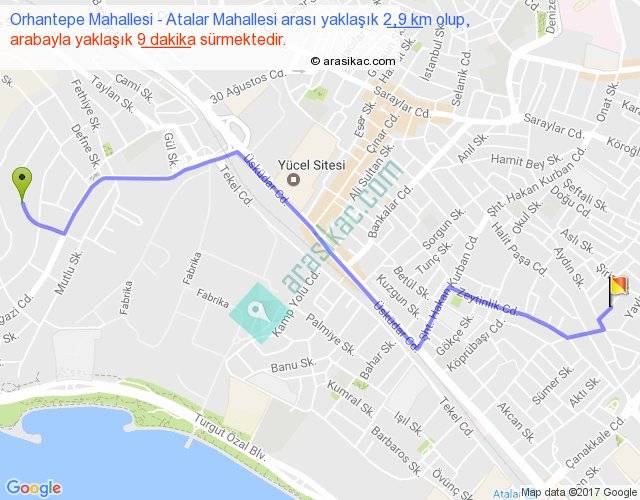 Orhantepe Mahallesi - Atalar Mahallesi arası yaklaşık olarak 90 km/h ile yukarıda belirtilen sürede olup, iki yerin kuş uçuşu uzaklığı (mesafesi) 2'dir. Yolculuk otobüsle 11 dakika sürmektedir.