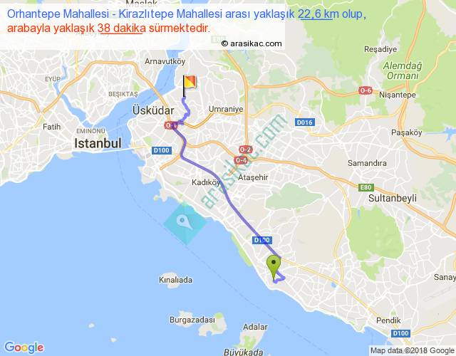 Orhantepe Mahallesi - Kirazlıtepe Mahallesi arası yaklaşık olarak 90 km/h ile yukarıda belirtilen sürede olup, iki yerin kuş uçuşu uzaklığı (mesafesi) 16'dir. Yolculuk otobüsle 49 dakika sürmektedir.