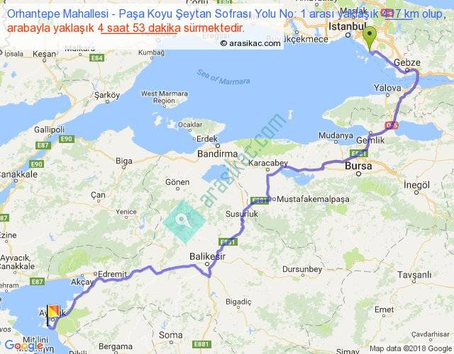 Orhantepe Mahallesi - Paşa Koyu Şeytan Sofrası Yolu No: 1 arası yaklaşık olarak 90 km/h ile yukarıda belirtilen sürede olup, iki yerin kuş uçuşu uzaklığı (mesafesi) 277'dir. Eğer belirtilen yerler arasında uçak seferi var ise bu süre uçakla 25 dakika'ya kadar düşebilir. Yolculuk otobüsle 6 saat 20 dakika sürmektedir.