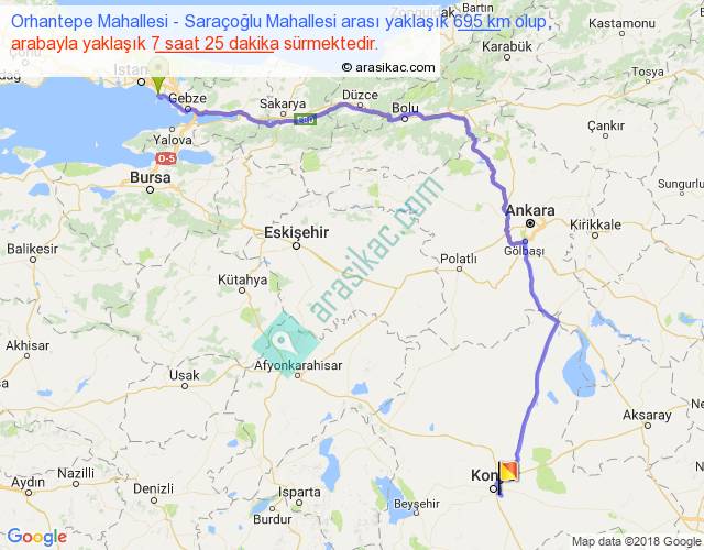 Orhantepe Mahallesi - Saraçoğlu Mahallesi arası yaklaşık olarak 90 km/h ile yukarıda belirtilen sürede olup, iki yerin kuş uçuşu uzaklığı (mesafesi) 449'dir. Eğer belirtilen yerler arasında uçak seferi var ise bu süre uçakla 41 dakika'ya kadar düşebilir. Yolculuk otobüsle 9 saat 38 dakika sürmektedir.