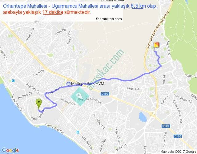 Orhantepe Mahallesi - Uğurmumcu Mahallesi arası yaklaşık olarak 90 km/h ile yukarıda belirtilen sürede olup, iki yerin kuş uçuşu uzaklığı (mesafesi) 6'dir. Yolculuk otobüsle 22 dakika sürmektedir.