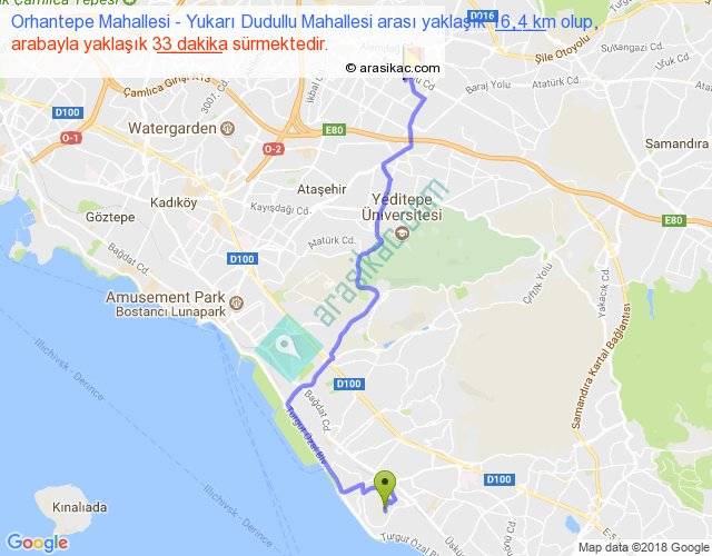 Orhantepe Mahallesi - Yukarı Dudullu Mahallesi arası yaklaşık olarak 90 km/h ile yukarıda belirtilen sürede olup, iki yerin kuş uçuşu uzaklığı (mesafesi) 11'dir. Yolculuk otobüsle 42 dakika sürmektedir.