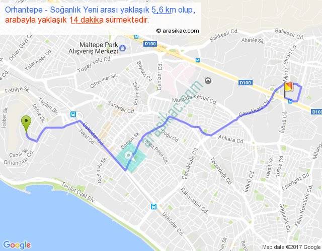 Orhantepe - Soğanlık Yeni arası yaklaşık olarak 90 km/h ile yukarıda belirtilen sürede olup, iki yerin kuş uçuşu uzaklığı (mesafesi) 4'dir. Yolculuk otobüsle 18 dakika sürmektedir.