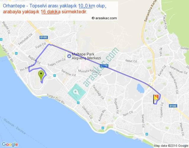 Orhantepe - Topselvi arası yaklaşık olarak 90 km/h ile yukarıda belirtilen sürede olup, iki yerin kuş uçuşu uzaklığı (mesafesi) 6'dir. Yolculuk otobüsle 20 dakika sürmektedir.