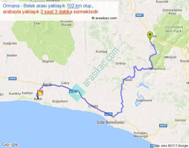 Ormana - Belek arası yaklaşık olarak 90 km/h ile yukarıda belirtilen sürede olup, iki yerin kuş uçuşu uzaklığı (mesafesi) 52'dir. Yolculuk otobüsle 2 saat 39 dakika sürmektedir.