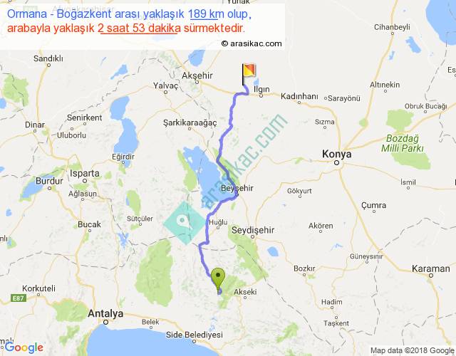 Ormana - Boğazkent arası yaklaşık olarak 90 km/h ile yukarıda belirtilen sürede olup, iki yerin kuş uçuşu uzaklığı (mesafesi) 141'dir. Yolculuk otobüsle 3 saat 44 dakika sürmektedir.
