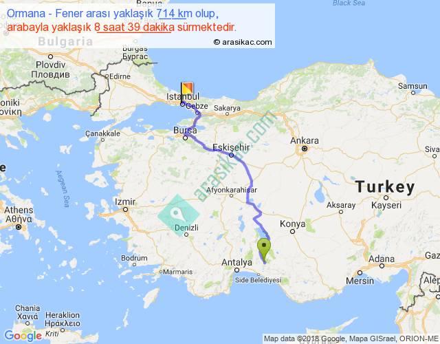 Ormana - Fener arası yaklaşık olarak 90 km/h ile yukarıda belirtilen sürede olup, iki yerin kuş uçuşu uzaklığı (mesafesi) 492'dir. Eğer belirtilen yerler arasında uçak seferi var ise bu süre uçakla 45 dakika'ya kadar düşebilir. Yolculuk otobüsle 11 saat 14 dakika sürmektedir.