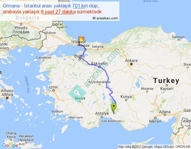 Ormana - İstanbul arası yaklaşık olarak 90 km/h ile yukarıda belirtilen sürede olup, iki yerin kuş uçuşu uzaklığı (mesafesi) 484'dir. Eğer belirtilen yerler arasında uçak seferi var ise bu süre uçakla 44 dakika'ya kadar düşebilir. Yolculuk otobüsle 10 saat 59 dakika sürmektedir.