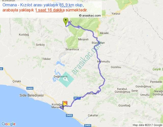 Ormana - Kızılot arası yaklaşık olarak 90 km/h ile yukarıda belirtilen sürede olup, iki yerin kuş uçuşu uzaklığı (mesafesi) 39'dir. Yolculuk otobüsle 1 saat 38 dakika sürmektedir.