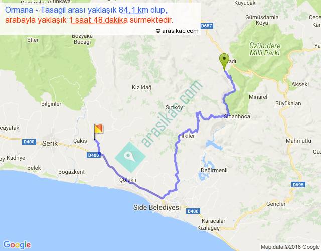 Ormana - Tasagil arası yaklaşık olarak 90 km/h ile yukarıda belirtilen sürede olup, iki yerin kuş uçuşu uzaklığı (mesafesi) 35'dir. Yolculuk otobüsle 2 saat 20 dakika sürmektedir.