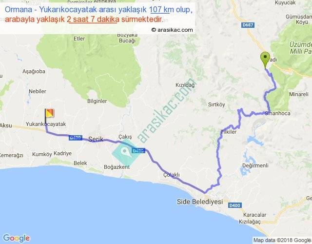 Ormana - Yukarıkocayatak arası yaklaşık olarak 90 km/h ile yukarıda belirtilen sürede olup, iki yerin kuş uçuşu uzaklığı (mesafesi) 56'dir. Yolculuk otobüsle 2 saat 45 dakika sürmektedir.