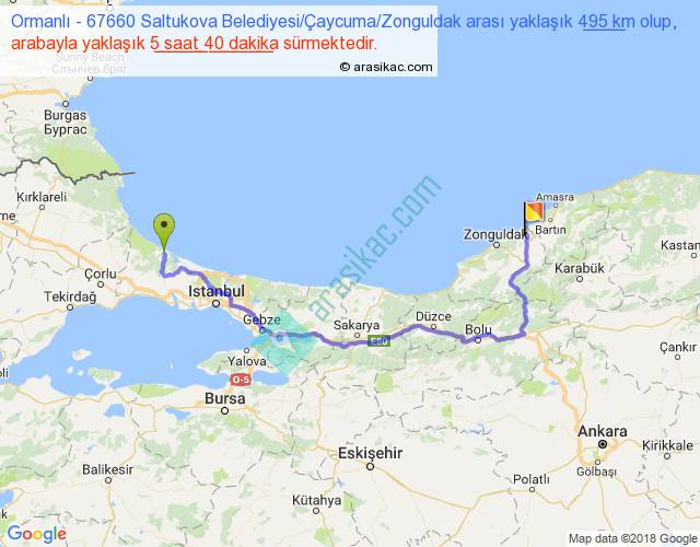 Ormanlı - 67660 Saltukova Belediyesi Çaycuma Zonguldak arası yaklaşık olarak 90 km/h ile yukarıda belirtilen sürede olup, iki yerin kuş uçuşu uzaklığı (mesafesi) 302'dir. Eğer belirtilen yerler arasında uçak seferi var ise bu süre uçakla 27 dakika'ya kadar düşebilir. Yolculuk otobüsle 7 saat 22 dakika sürmektedir.