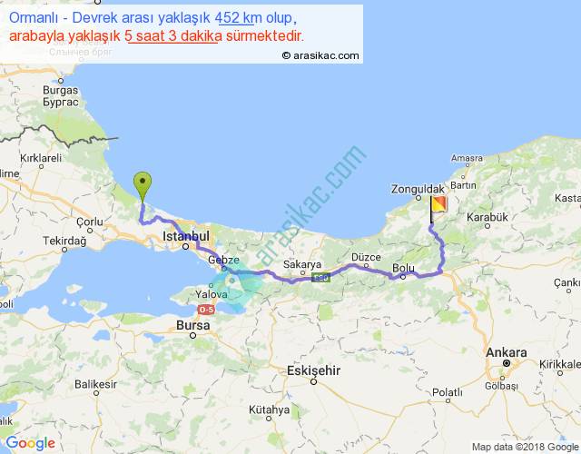 Ormanlı - Devrek arası yaklaşık olarak 90 km/h ile yukarıda belirtilen sürede olup, iki yerin kuş uçuşu uzaklığı (mesafesi) 291'dir. Eğer belirtilen yerler arasında uçak seferi var ise bu süre uçakla 26 dakika'ya kadar düşebilir. Yolculuk otobüsle 6 saat 33 dakika sürmektedir.