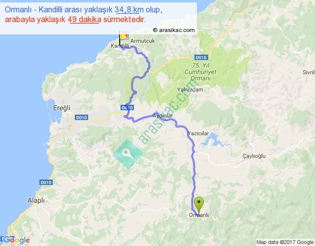 Ormanlı - Kandilli arası yaklaşık olarak 90 km/h ile yukarıda belirtilen sürede olup, iki yerin kuş uçuşu uzaklığı (mesafesi) 22'dir. Yolculuk otobüsle 1 saat 3 dakika sürmektedir.