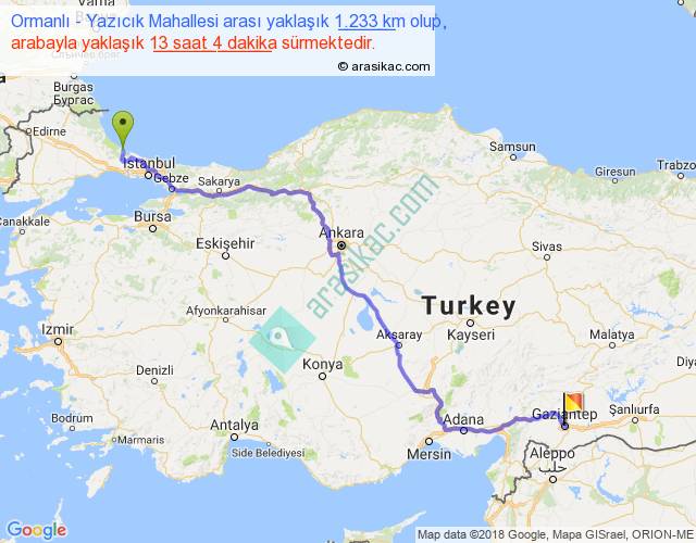 Ormanlı - Yazıcık Mahallesi arası yaklaşık olarak 90 km/h ile yukarıda belirtilen sürede olup, iki yerin kuş uçuşu uzaklığı (mesafesi) 902'dir. Eğer belirtilen yerler arasında uçak seferi var ise bu süre uçakla 1 saat 23 dakika'ya kadar düşebilir. Yolculuk otobüsle 16 saat 59 dakika sürmektedir.
