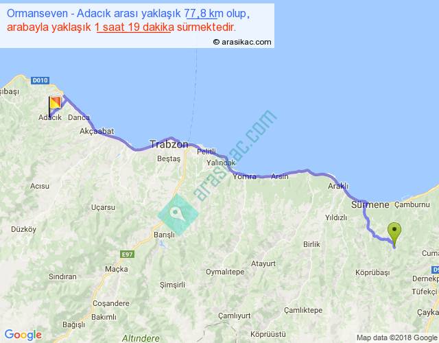 Ormanseven - Adacık arası yaklaşık olarak 90 km/h ile yukarıda belirtilen sürede olup, iki yerin kuş uçuşu uzaklığı (mesafesi) 62'dir. Yolculuk otobüsle 1 saat 42 dakika sürmektedir.