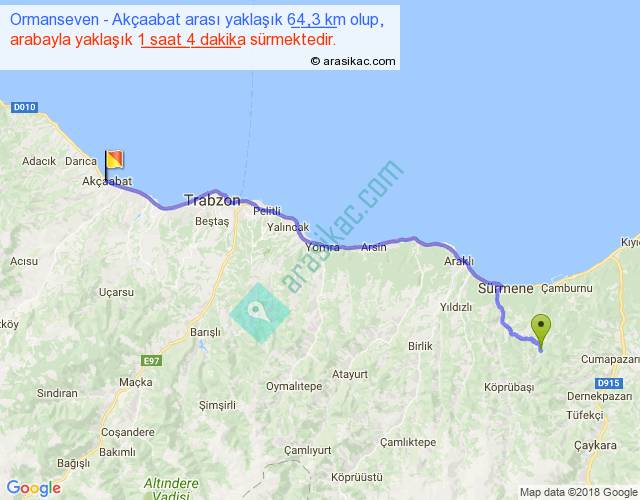 Ormanseven - Akçaabat arası yaklaşık olarak 90 km/h ile yukarıda belirtilen sürede olup, iki yerin kuş uçuşu uzaklığı (mesafesi) 53'dir. Yolculuk otobüsle 1 saat 23 dakika sürmektedir.