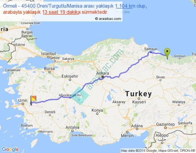 Örmeli - 45400 Ören Turgutlu Manisa arası yaklaşık olarak 90 km/h ile yukarıda belirtilen sürede olup, iki yerin kuş uçuşu uzaklığı (mesafesi) 877'dir. Eğer belirtilen yerler arasında uçak seferi var ise bu süre uçakla 1 saat 20 dakika'ya kadar düşebilir. Yolculuk otobüsle 17 saat 18 dakika sürmektedir.