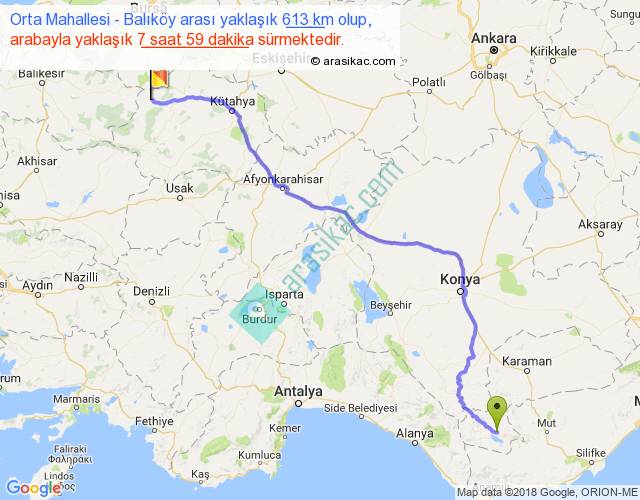 Orta Mahallesi - Balıköy arası yaklaşık olarak 90 km/h ile yukarıda belirtilen sürede olup, iki yerin kuş uçuşu uzaklığı (mesafesi) 458'dir. Eğer belirtilen yerler arasında uçak seferi var ise bu süre uçakla 42 dakika'ya kadar düşebilir. Yolculuk otobüsle 10 saat 22 dakika sürmektedir.