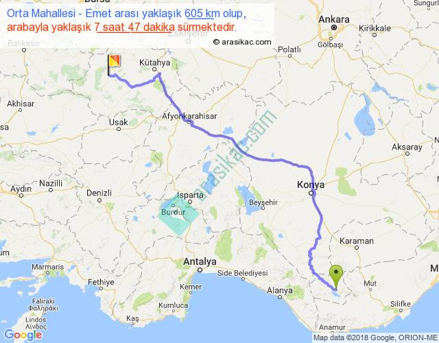 Orta Mahallesi - Emet arası yaklaşık olarak 90 km/h ile yukarıda belirtilen sürede olup, iki yerin kuş uçuşu uzaklığı (mesafesi) 435'dir. Eğer belirtilen yerler arasında uçak seferi var ise bu süre uçakla 40 dakika'ya kadar düşebilir. Yolculuk otobüsle 10 saat 7 dakika sürmektedir.