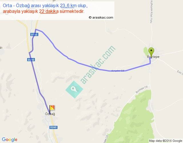 Orta - Özbağ arası yaklaşık olarak 90 km/h ile yukarıda belirtilen sürede olup, iki yerin kuş uçuşu uzaklığı (mesafesi) 12'dir. Yolculuk otobüsle 28 dakika sürmektedir.