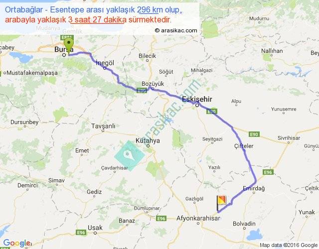 Ortabağlar - Esentepe arası yaklaşık olarak 90 km/h ile yukarıda belirtilen sürede olup, iki yerin kuş uçuşu uzaklığı (mesafesi) 203'dir. Yolculuk otobüsle 4 saat 29 dakika sürmektedir.
