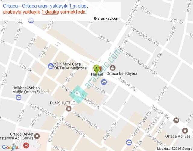 Ortaca - Ortaca arası yaklaşık olarak 90 km/h ile yukarıda belirtilen sürede olup, iki yerin kuş uçuşu uzaklığı (mesafesi) 0'dir. Yolculuk otobüsle 1 dakika sürmektedir.