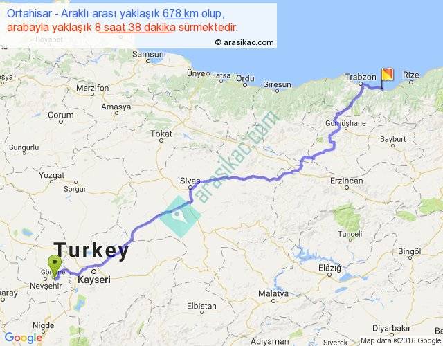 Ortahisar - Araklı arası yaklaşık olarak 90 km/h ile yukarıda belirtilen sürede olup, iki yerin kuş uçuşu uzaklığı (mesafesi) 510'dir. Eğer belirtilen yerler arasında uçak seferi var ise bu süre uçakla 47 dakika'ya kadar düşebilir. Yolculuk otobüsle 11 saat 13 dakika sürmektedir.