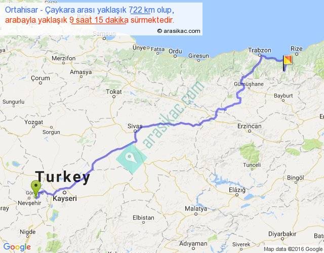 Ortahisar - Çaykara arası yaklaşık olarak 90 km/h ile yukarıda belirtilen sürede olup, iki yerin kuş uçuşu uzaklığı (mesafesi) 514'dir. Eğer belirtilen yerler arasında uçak seferi var ise bu süre uçakla 47 dakika'ya kadar düşebilir. Yolculuk otobüsle 12 saat 1 dakika sürmektedir.