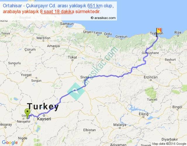 Ortahisar - Çukurçayır Cd. arası yaklaşık olarak 90 km/h ile yukarıda belirtilen sürede olup, iki yerin kuş uçuşu uzaklığı (mesafesi) 489'dir. Eğer belirtilen yerler arasında uçak seferi var ise bu süre uçakla 45 dakika'ya kadar düşebilir. Yolculuk otobüsle 10 saat 47 dakika sürmektedir.