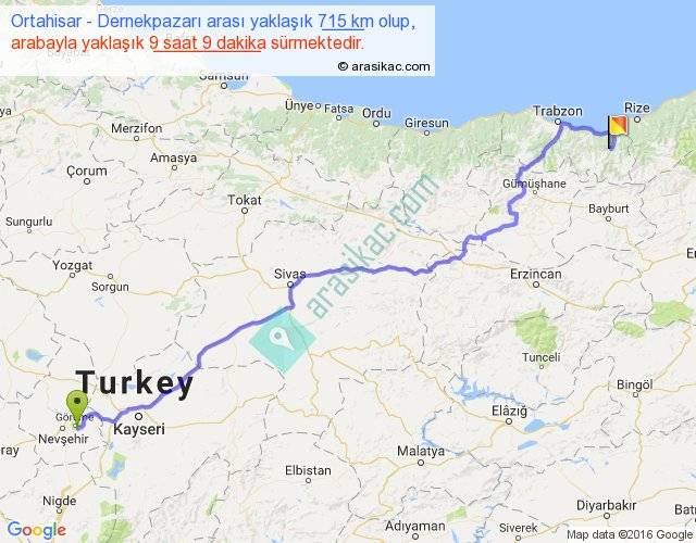 Ortahisar - Dernekpazarı arası yaklaşık olarak 90 km/h ile yukarıda belirtilen sürede olup, iki yerin kuş uçuşu uzaklığı (mesafesi) 517'dir. Eğer belirtilen yerler arasında uçak seferi var ise bu süre uçakla 47 dakika'ya kadar düşebilir. Yolculuk otobüsle 11 saat 53 dakika sürmektedir.