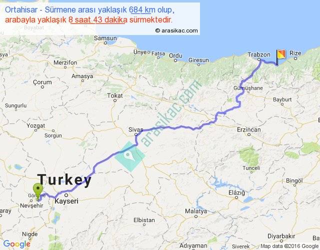 Ortahisar - Sürmene arası yaklaşık olarak 90 km/h ile yukarıda belirtilen sürede olup, iki yerin kuş uçuşu uzaklığı (mesafesi) 513'dir. Eğer belirtilen yerler arasında uçak seferi var ise bu süre uçakla 47 dakika'ya kadar düşebilir. Yolculuk otobüsle 11 saat 19 dakika sürmektedir.