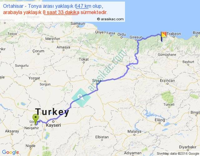 Ortahisar - Tonya arası yaklaşık olarak 90 km/h ile yukarıda belirtilen sürede olup, iki yerin kuş uçuşu uzaklığı (mesafesi) 452'dir. Eğer belirtilen yerler arasında uçak seferi var ise bu süre uçakla 41 dakika'ya kadar düşebilir. Yolculuk otobüsle 11 saat 6 dakika sürmektedir.