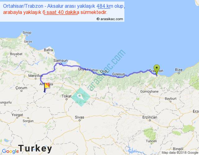 Ortahisar Trabzon - Aksalur arası yaklaşık olarak 90 km/h ile yukarıda belirtilen sürede olup, iki yerin kuş uçuşu uzaklığı (mesafesi) 334'dir. Eğer belirtilen yerler arasında uçak seferi var ise bu süre uçakla 30 dakika'ya kadar düşebilir. Yolculuk otobüsle 8 saat 40 dakika sürmektedir.