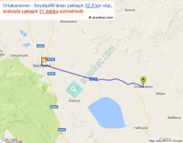 Ortakaraören - Seydişehir arası yaklaşık olarak 90 km/h ile yukarıda belirtilen sürede olup, iki yerin kuş uçuşu uzaklığı (mesafesi) 22'dir. Yolculuk otobüsle 27 dakika sürmektedir.