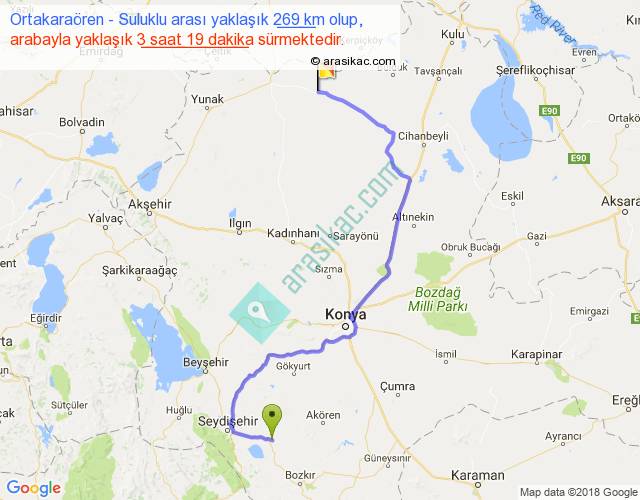 Ortakaraören - Suluklu arası yaklaşık olarak 90 km/h ile yukarıda belirtilen sürede olup, iki yerin kuş uçuşu uzaklığı (mesafesi) 168'dir. Yolculuk otobüsle 4 saat 18 dakika sürmektedir.