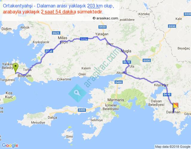 Ortakentyahşi - Dalaman arası yaklaşık olarak 90 km/h ile yukarıda belirtilen sürede olup, iki yerin kuş uçuşu uzaklığı (mesafesi) 132'dir. Yolculuk otobüsle 3 saat 46 dakika sürmektedir.