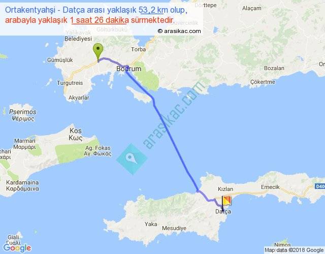Ortakentyahşi - Datça arası yaklaşık olarak 90 km/h ile yukarıda belirtilen sürede olup, iki yerin kuş uçuşu uzaklığı (mesafesi) 47'dir. Yolculuk otobüsle 1 saat 51 dakika sürmektedir.