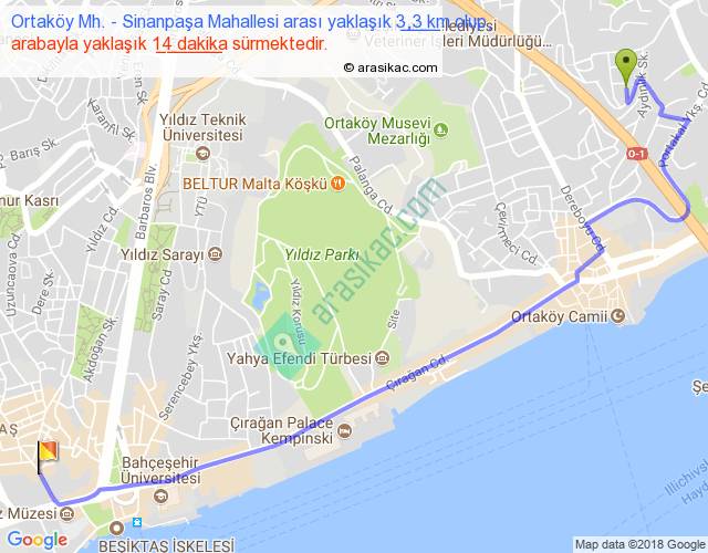 Ortaköy Mh. - Sinanpaşa Mahallesi arası yaklaşık olarak 90 km/h ile yukarıda belirtilen sürede olup, iki yerin kuş uçuşu uzaklığı (mesafesi) 2'dir. Yolculuk otobüsle 18 dakika sürmektedir.