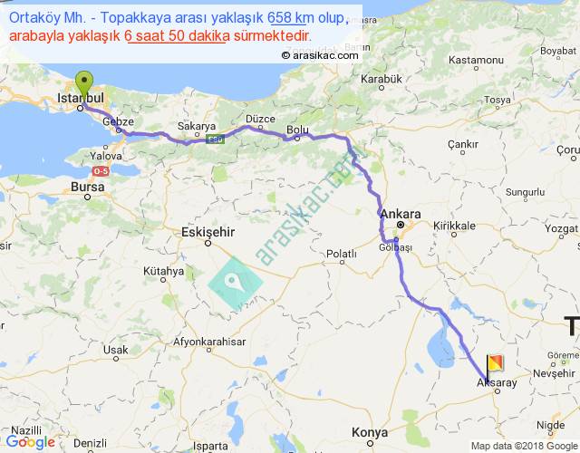 Ortaköy Mh. - Topakkaya arası yaklaşık olarak 90 km/h ile yukarıda belirtilen sürede olup, iki yerin kuş uçuşu uzaklığı (mesafesi) 506'dir. Eğer belirtilen yerler arasında uçak seferi var ise bu süre uçakla 46 dakika'ya kadar düşebilir. Yolculuk otobüsle 8 saat 53 dakika sürmektedir.